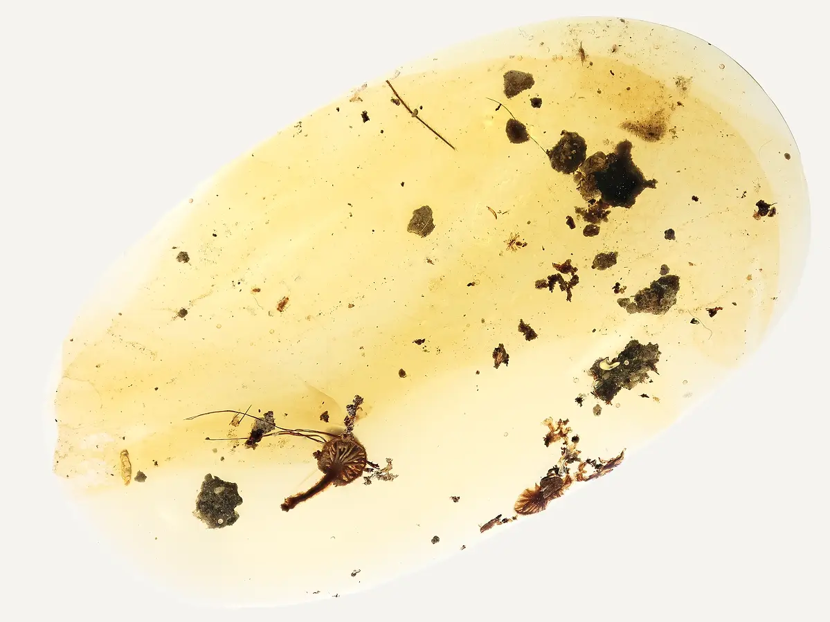 Fossil of a gilled mushroom representing part of the forest floor community. Such fungi grew on decaying wood and leaf litter in the humid tropical forests of the Cretaceous period.